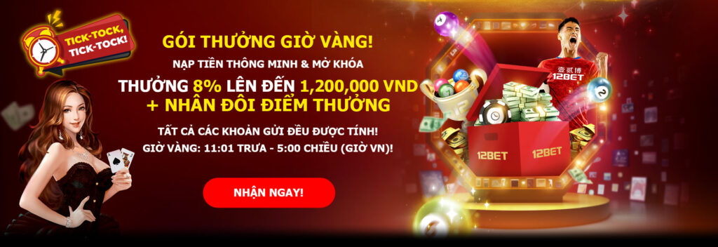 • Siêu thưởng cho VIP: Các thành viên thuộc dạng VIP ở 12 Bet sẽ có nhiều cơ hội nhận thưởng hơn ở các sự kiện. Hơn nữa giá trị phần thưởng của họ cũng đều cao hơn so với thông thường tùy vào mức đóng góp.